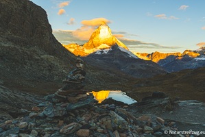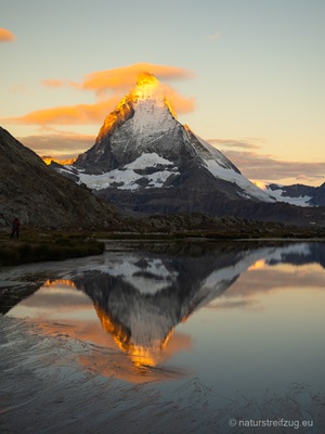Von der Station Rotenboden waren es noch 10 min abwärts bis zum Riffelsee zu laufen. Genug Zeit blieb übrig, um die Kameras zu richten und darauf zu warten, bis die ersten Sonnenstrahlen die Matterhorn-Spitze beleuchteten und sich das ganze Geschehen im Riffelsee spiegelte - ein magischer Moment.